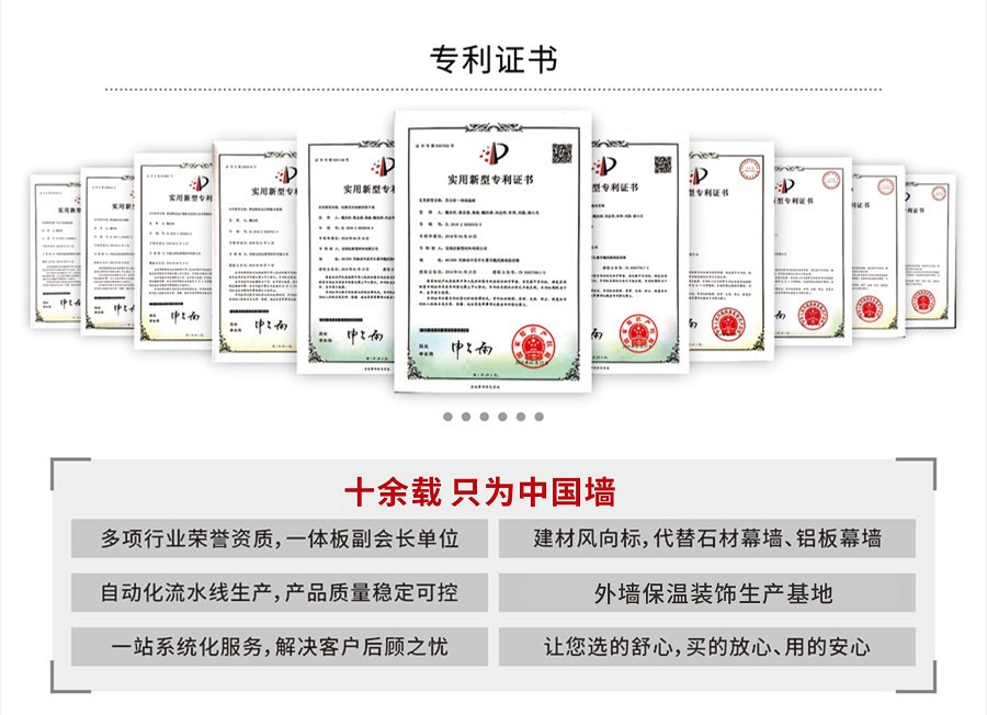 寶潤達(dá)在保溫裝飾一體板領(lǐng)域的優(yōu)勢,不僅僅只是建立在現(xiàn)代化的生產(chǎn)車間、先進(jìn)的制造工藝、卓越的產(chǎn)品性能上。寶潤達(dá)自1996年涉足外墻裝飾領(lǐng)域以來,積累了24年的行業(yè)經(jīng)驗(yàn),擁有一支行業(yè)高水準(zhǔn)的設(shè)計(jì)、安裝施工隊(duì)伍,真正具備集產(chǎn)品、設(shè)計(jì)、施工為一體,打造精品工程的能力。只要您給寶潤達(dá)參與的機(jī)會(huì),我們就有十足的信心向您提供放心的系統(tǒng)化解決方案。